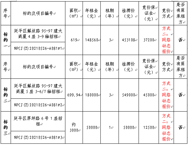 1.租賃用途:租賃標的符合地類用途的合法經營行業(其中租賃標的一至標的二地類用途為商務金融;租賃標的三地類用途為倉儲用地)。 2.為便于競買人計算面積單價,網絡競價以年租金底價進行報價,最終成交價以年租金的最高報價×租賃期限。 3. 起租時間: 3.1原承租方起租時間:自新合同簽訂之日起計算; 3.2新承租方起租時間:成交次日起30日內,若原承租方未在合同到期日前退出該租賃房產,新承租方合同生效、物業交付和租金計取時間以出租方發出《物業具備交付條件的通知》為準,在該時間內不以出租方違約論處。 4.裝修期:裝修期期間無減免租金。 6.本次租賃房屋不包括室內裝修、室內設施及水、電、空調等設備,承租方若需要上述設備設施,須與原承租方協商轉讓。 7.具體事項以與出租方簽訂《房屋租賃合同》為準。 提示:以上標的概況由出租方提供披露,具體項目標的狀況以現場看樣和相關文件的數據為準。 |
