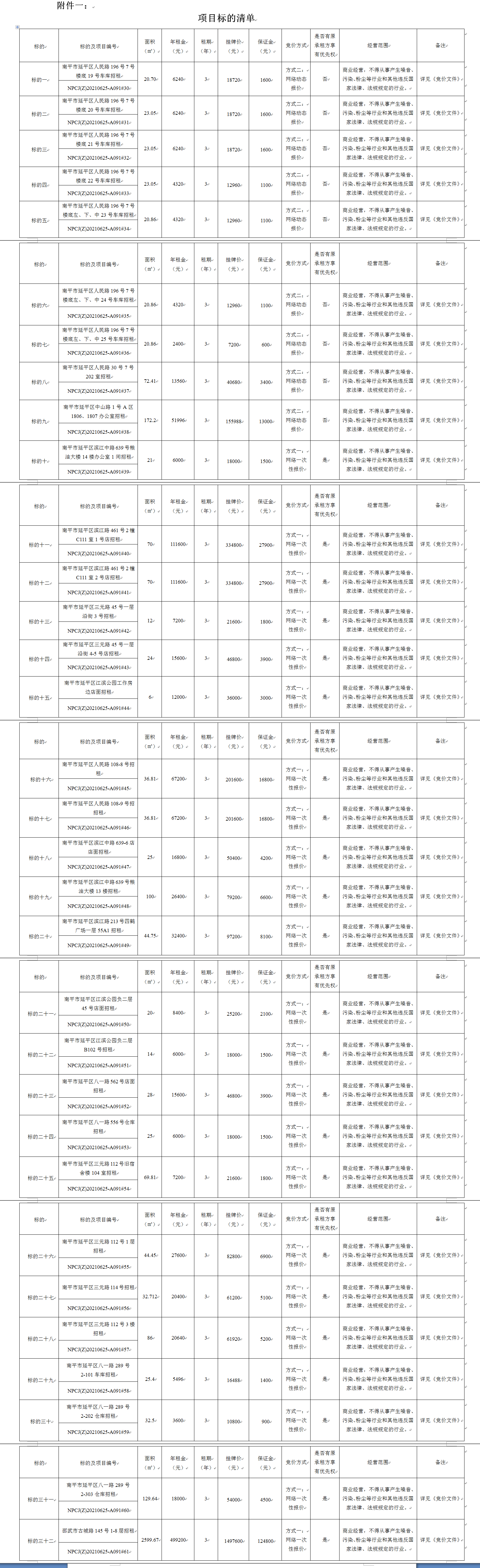 1.租賃用途:詳見附件一。 2.于競買人計算面積單價,網絡競價以年租金底價進行報價,最終成交總額以年租金的最高報價×租賃期限。 3.本次競價標的十至標的三十二屬在同等條件下原承租方享有優先承租權。 4.裝修情況:以實際現場看樣為準。 5.原租賃合同到期日: 5.1租賃標的標的十至標的十五、標的二十五至標的二十七及標的二十九至三十原租賃合同于2021年5月31日到期; 5.2租賃標的十六至標的二十四及標的三十二原租賃合同于2021年6月30日到期; 5.3租賃標的三十一原租賃合同于2021年6月19日到期; 5.4租賃標的二十八原租賃合同于2021年4月30日到期。 6.起租時間:若原承租人未報名參加競租或報名參加競租未取得標的,原承租人應于原租賃合同到期次日起7天內將承租房產退還出租方,若原承租人報名參加競租取得標的的,起租時間自成交公示期滿次日起計算(若原合同期限未到期的新合同自然延順);新承租人起租時間自出租方通知接收房產之日起計算。 7.具體事項以與出租方簽訂《房屋租賃合同》為準。提示:以上標的概況由出租方提供披露,具體項目標的狀況以現場看樣和相關文件的數據為準。 |