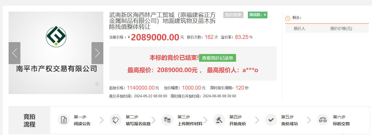 武夷新區海西林產工貿城(原福建省正方金屬制品有限公司)地面建筑物及苗木拆除殘值整體轉讓項目,轉讓底價114萬元,場內服務圍繞資產特性,深究市場價值,廣泛進行市場推介,項目掛牌期間僅南平市產權交易公示官網和南平市公共資源交易中心對應的公告點擊率就達到1220余次。公告期間,項目經辦人員耐心地為各意向競標人就競價文件做講解,細心地對各意向競標人進行競價指導,使意向競標人對競價系統充分地熟悉。競價過程公開透明,來自省外的二十四家意向競標人在互聯網上展開了“沒有硝煙”的競爭,整個競價過程一直處于膠著狀態,最終在歷經162次報價后以208.90萬元成交,增值高達94.90萬元。再創今年以來廢舊資產項目增值新高。